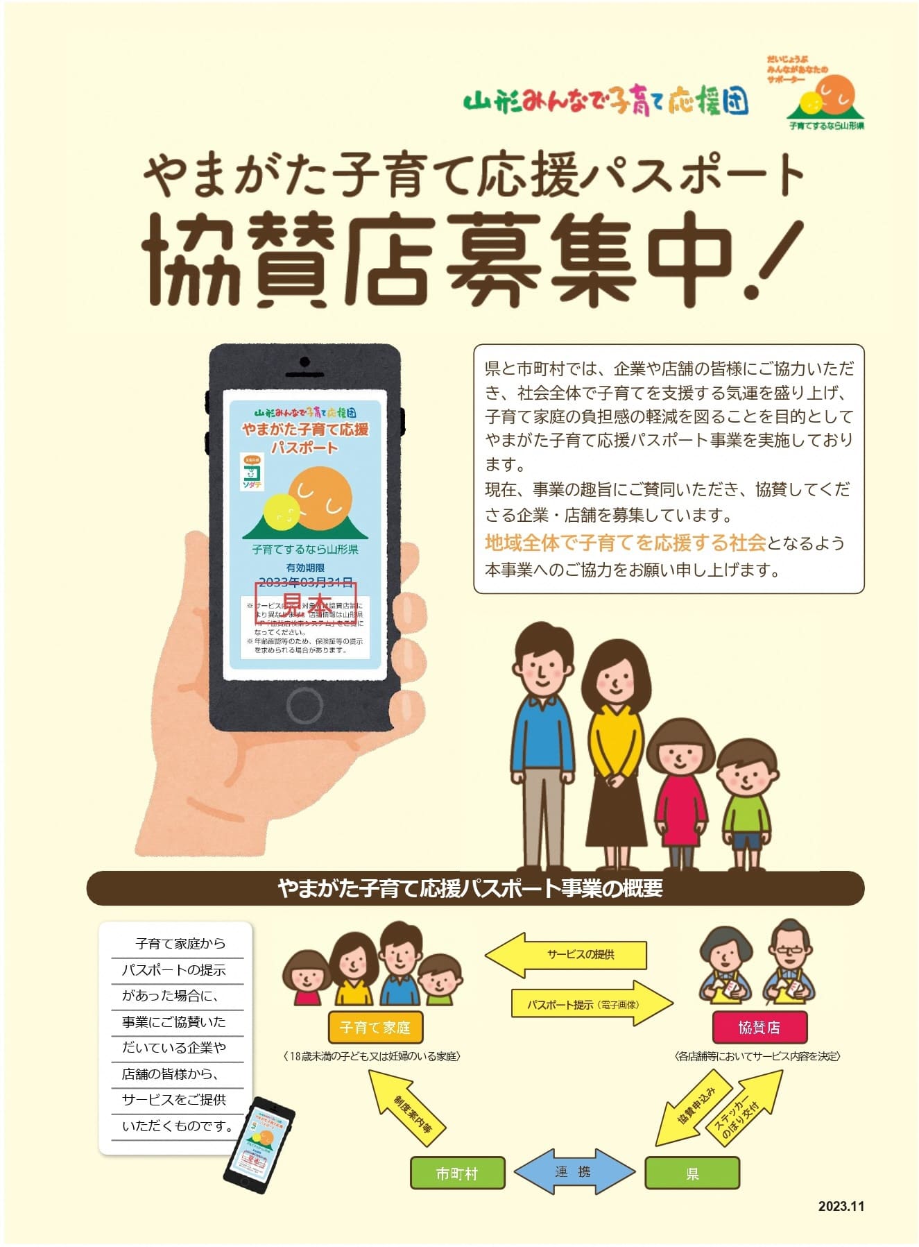 「やまがた子育て応援パスポート事業」は子育て家庭にパスポートを発行し、協賛店でご提示いただくと割引等様々なサービスが受けられるもので、社会全体で子育てを応援する気運の醸成を目的として、企業・店舗様のご協力により実施しております。