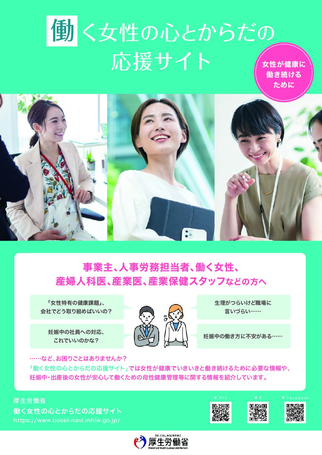 女性が健康でいきいきと働き続けるために、妊娠・出産だけではなく月経や更年期障害も含めた、包括的な働く女性の健康支援に関する情報を紹介しています。ぜひご活用ください。