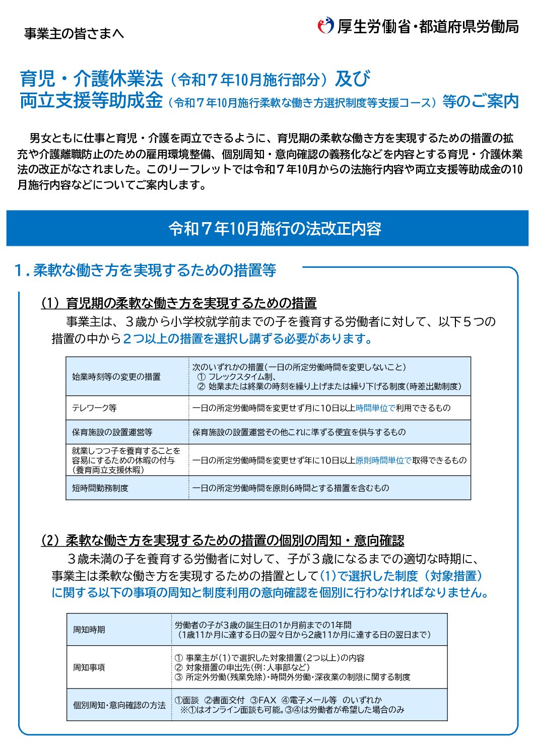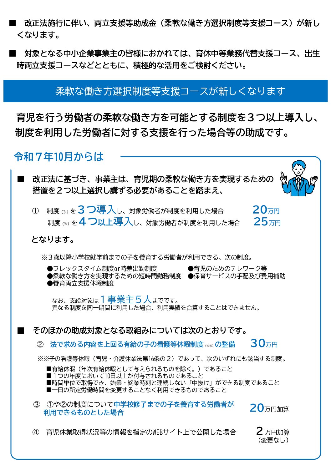 令和7年10月の「育児・介護休業法」改正により、育児期の柔軟な働き方を実現するための措置が拡充されました。改正法施行に伴い、両立支援等助成金「柔軟な働き方選択制度等支援コース」が新しくなります!