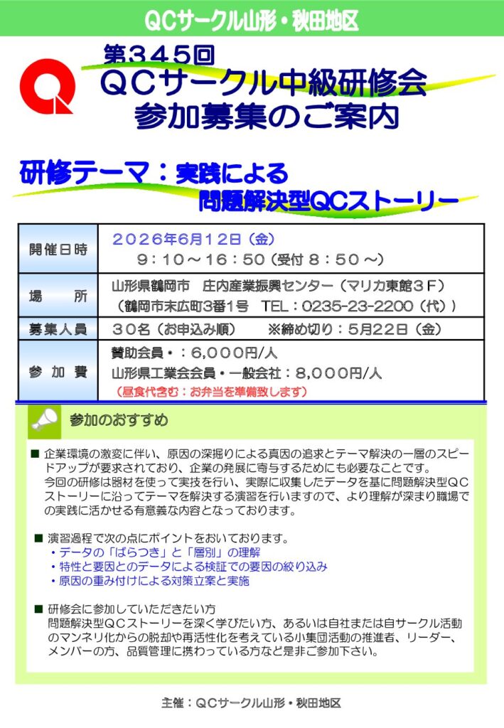 QCサークル山形・秋田地区では、小集団改善活動(QCサークル活動)の活性化とレベルアップに向けた取組みを行っています。6月12日(金)に下記のとおり第345回山形・秋田地区QCサークル研修会を現地開催で開催しますので、ご案内いたします。